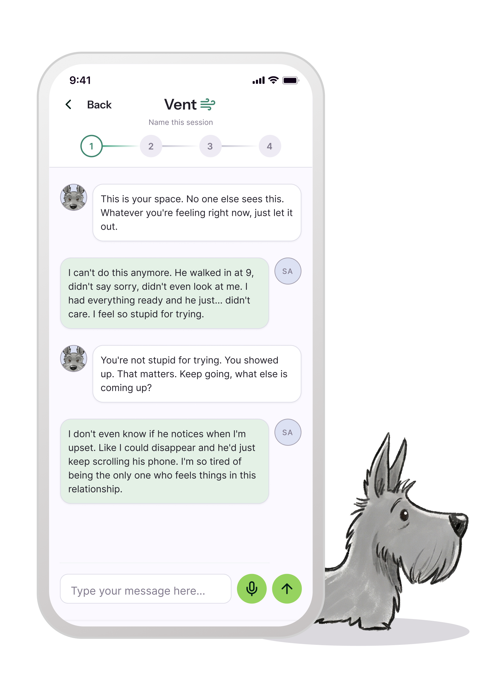 This space is yours alone. Say exactly what you're feeling, type it or use your voice. No one else will ever see this. Putting emotions into words reduces their intensity. Your mind shifts from reacting to reflecting.
